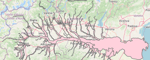 Aree allagabili predisposte nell'ambito del Piano di Gestione del Rischio di Alluvioni (2024-07-30) per l'Unità di Gestione del bacino del Po (UoM-ITN008) e relative a scenari di scarsa probabilità (L) - pericolosità bassa (P1) per il Reticolo principale ...