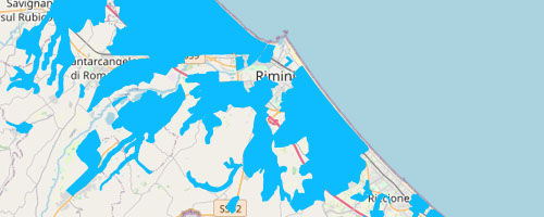 Aree allagabili predisposte nell'ambito del Piano di Gestione del Rischio di Alluvioni (ottobre 2022) per l'Unità di Gestione del bacino Marecchia Conca (UoM-ITI01319) e relative a scenari di media probabilità (M) - pericolosità media (P2) per il Reticolo...