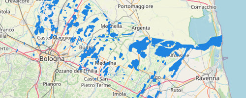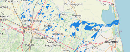 Aree allagabili predisposte nell'ambito del Piano di Gestione del Rischio di Alluvioni (vigente) per l'Unità di Gestione del bacino Reno (UoM-ITI021) e relative a scenari di media probabilità (M) - pericolosità media (P2) per il Reticolo Secondario di Pia...