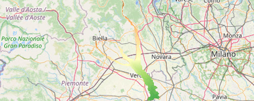 Modello Digitale del Terreno (DTM) con risoluzione a terra di 1 metro derivante da scansione LiDAR su piattaforma aerea. Il rilievo ha interessato l’asta del fiume Sesia tra l’abitato di Varallo (provincia di Vercelli) e la sua foce nel fiume Po, il torre...