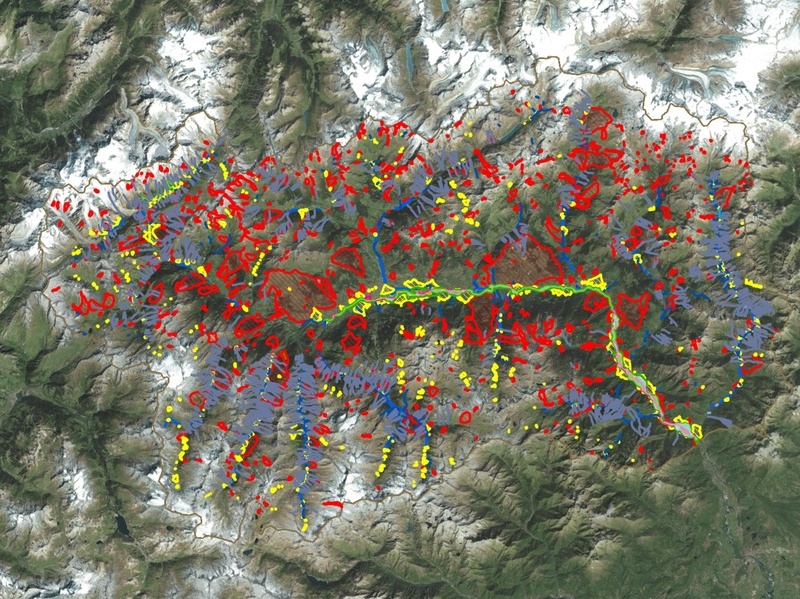 La mappa descrive i dissesti puntuali, lineari e poligonali estratti dalla banca dati del Centro Funzionale Regionale, con l’obiettivo di normare il territorio in funzione della pericolosità geologica.